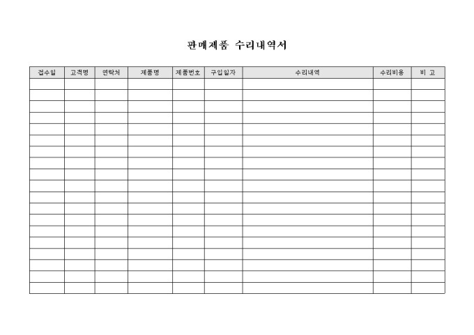 판매한 제품의 수리 발생시 사용되는 수리 내역서 입니다. 판매 제품명과 구입일자, 수리내역, 수리비용을 기록 할 수 있습니다.