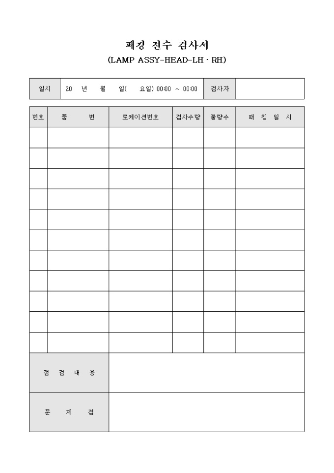 9,000원/월패킹 전수 검사서 입니다. 품번, 로케이션번호, 검사수량, 불량수, 패킹 일시로 구성되어 있습니다.