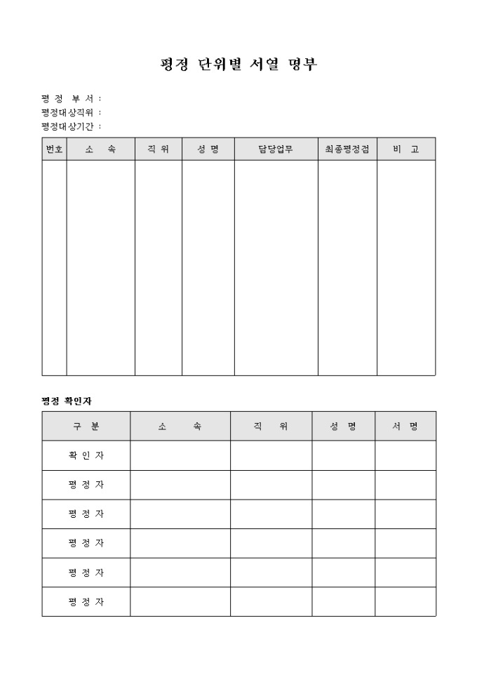 평가할 부서와 대상 직위에 대해 일정한 기간동안 평정하기 위해 사용하는 평정 단위별 서열 명부입니다.