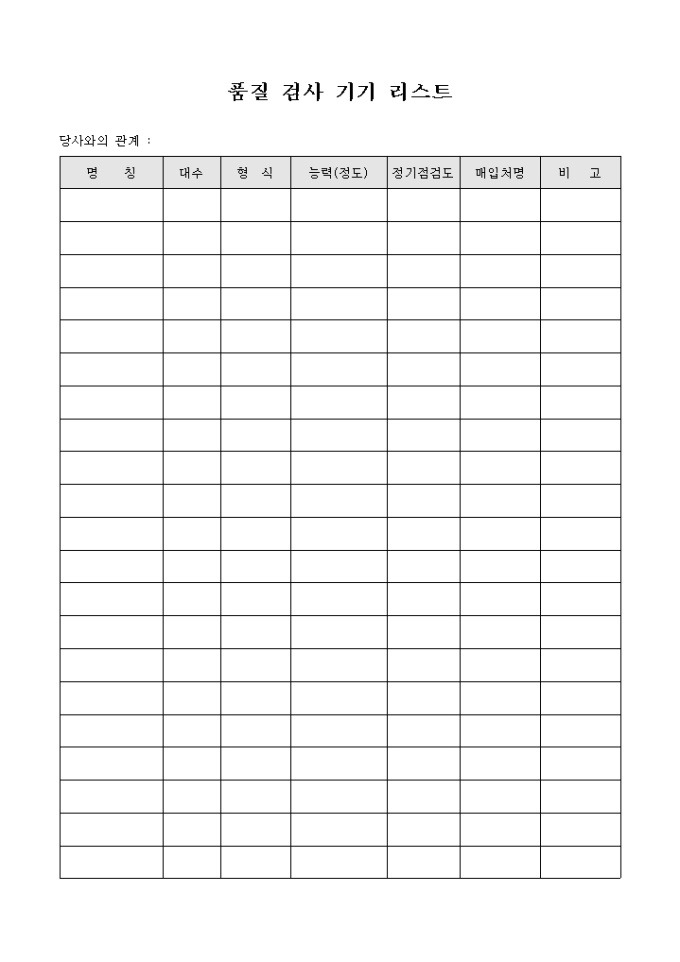 9,000원/월품질검사 기기 명단입니다. 품질 검사기기의 명칭과 점검도 매입처 등을 기록 할 수 있습니다.