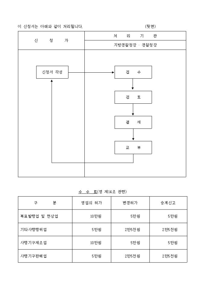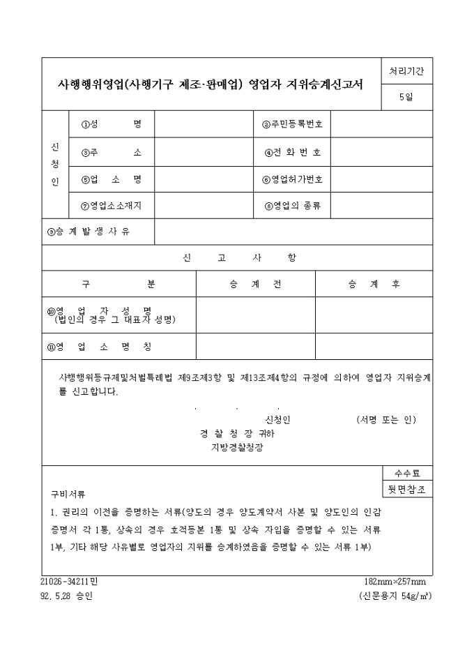 9,000원/월사행행위등규제및처벌특례법 제9조제3항 및 제13조제4항의 규정에 의한 사행행위영업(사행기구제조,판매업)영업자지위승계신고서입니다.