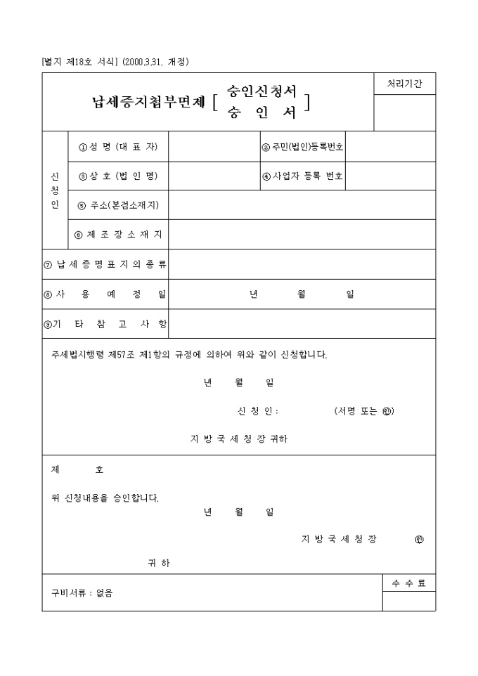 납세증지첩부면제승인신청서,승인서 양식입니다.