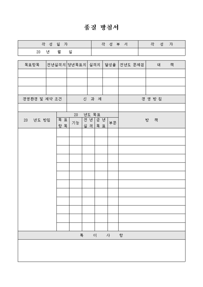 품질 방침서 입니다. 품질의 목표 방침과 방책등을 기록 할 수 있도록 구성되어 있습니다.