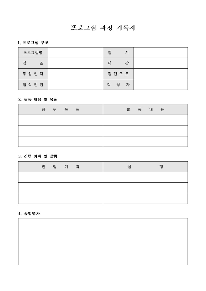 프로그램의 구조와 활동내용, 진행계획 및 실행, 종합평가를 포함한 프로그램의 모든 과정을 기록할 때 사용하는 프로그램 과정 기록지 입니다.