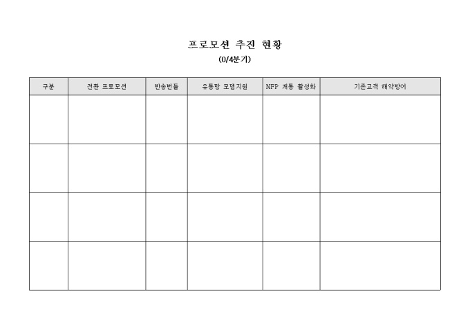 전환 프로모션, 반송번들, 유통망 모뎀지원, NFP 개통 활성화, 기존고객 해약방어 등의 항목으로 구성된 프로모션 추진 현황 양식입니다.