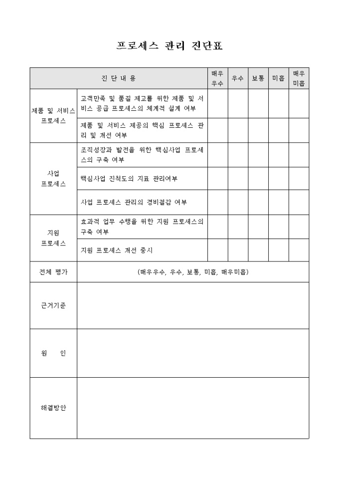 9,000원/월프로세스 관리 진단표 입니다. 진단내용별 결과를 평가하여 전체 평가후 미흡한 부분에 대한 해결방안을 기록 할 수 있습니다.