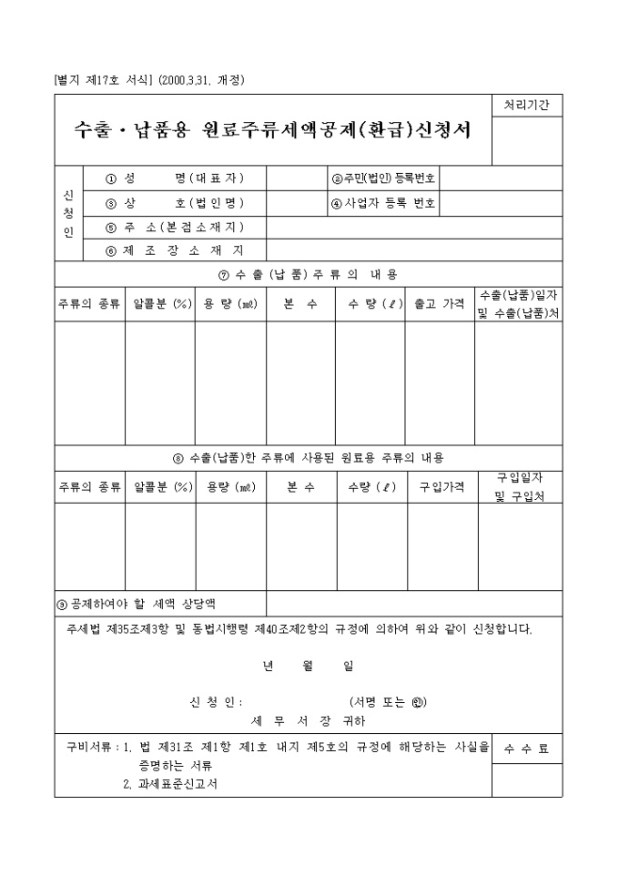 주세법 제35조제3항 및 동법시행령 제40조제2항의 규정에 의하여 위와 같이 신청하실때 사용하는 양식입니다.