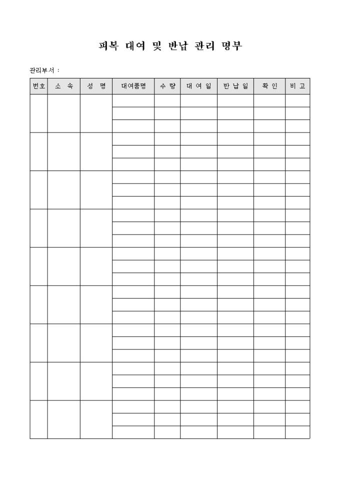 피복 대여 및 반납에 대한 내역을 기록하고 관리가 가능하도록 구성된 피복 대여 및 반납 관리 명부입니다.