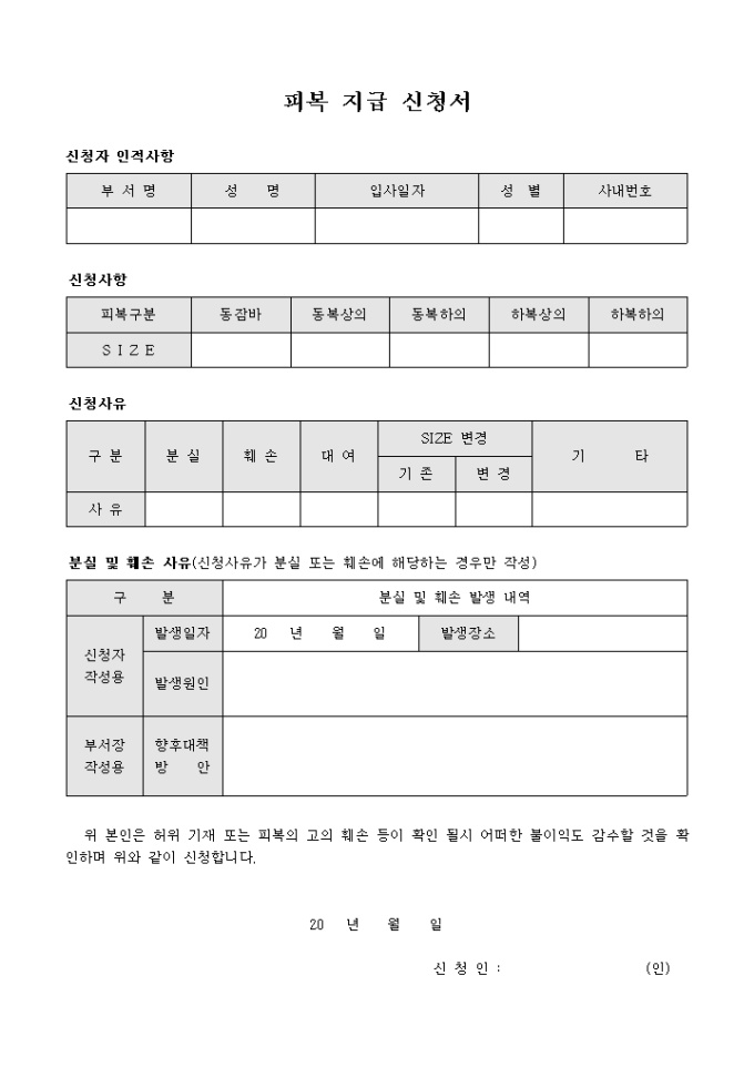 신규로 지급되거나 분실로 인한 피복 요청시 사용하는 피복 신청서입니다. 신청사유와 훼손사유를 기록 할 수 있습니다.