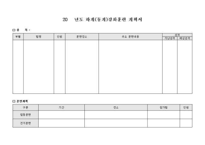 9,000원/월부별, 팀별 하계(동계) 강화훈련계획을 수립함에 있어서 훈련장소, 주요 훈련내용을 기입할 수 있으며 그에 따른 성적을 예상하고 총괄적인 훈련계획을 수립할 수 있게끔 제작된 서식입니다.