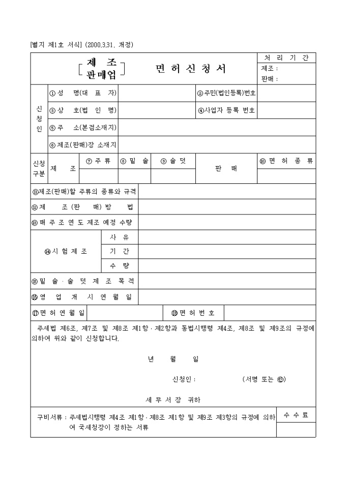 주세법 제6조, 제7조 및 제8조 제1항․제2항과 동법시행령 제4조, 제8조 및 제9조의 규정에 의하여 위와 같이 신청하실때 사용하는 양식입니다.