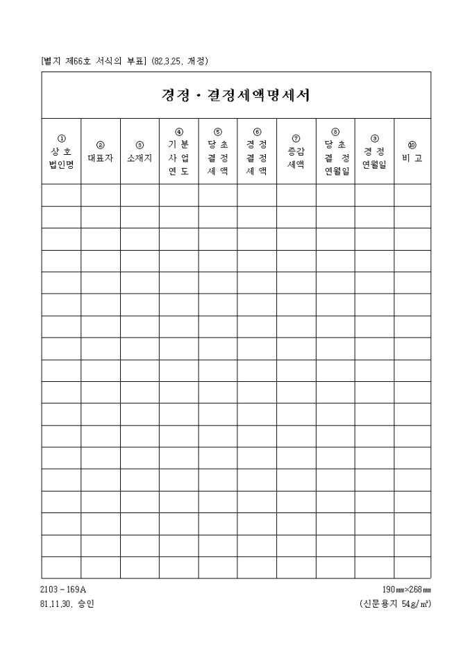 상호별 대표자,소재지,기본사업연도,당초결정세액,경정결정세액,증감세액등의 항목으로 구성된 양식입니다.