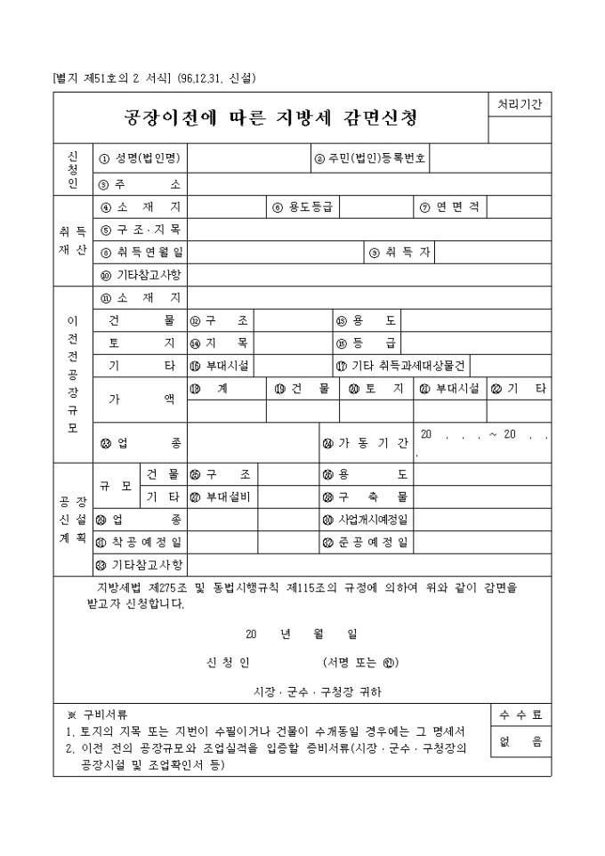 9,000원/월[별지 제51호의 2 서식] 공장이전에따른지방세감면신청 양식입니다. 지방세법 제275조 및 동법시행규칙 제115조의 규정에 의하여 위와 같이 감면을 받고자 신청하실때 사용하는 양식입니다.