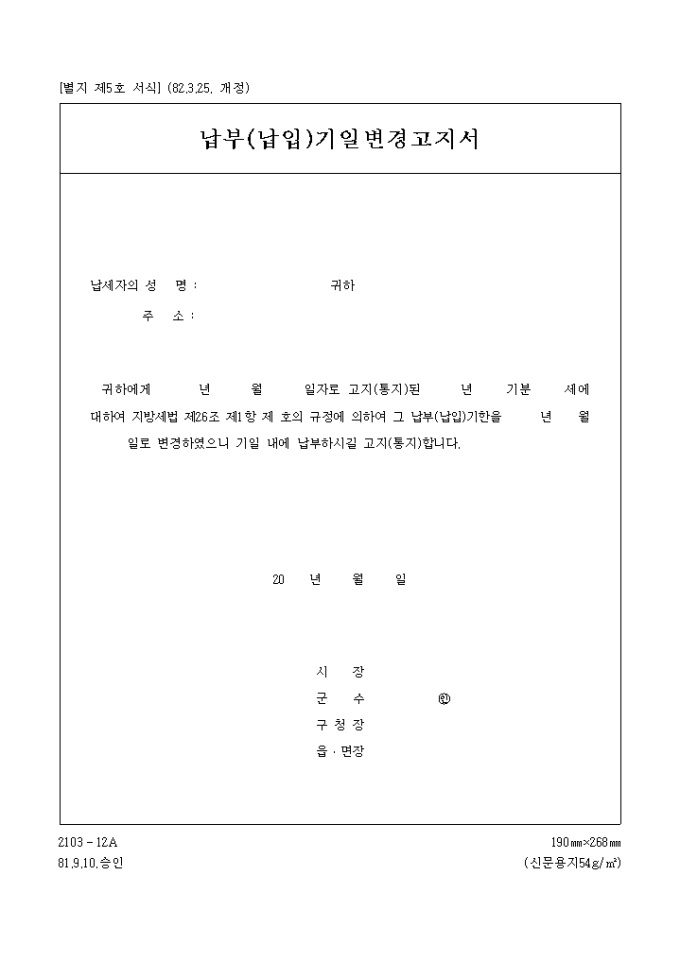 귀하에게 년 월 일자로 고지(통지)된 년 기분 세에 대하여 지방세법 제26조 제1항 제 호의 규정에 의하여 그 납부(납입)기한을 년 월 일로 변경하였으니 기일 내에 납부하시길 고지(통지)합니다.