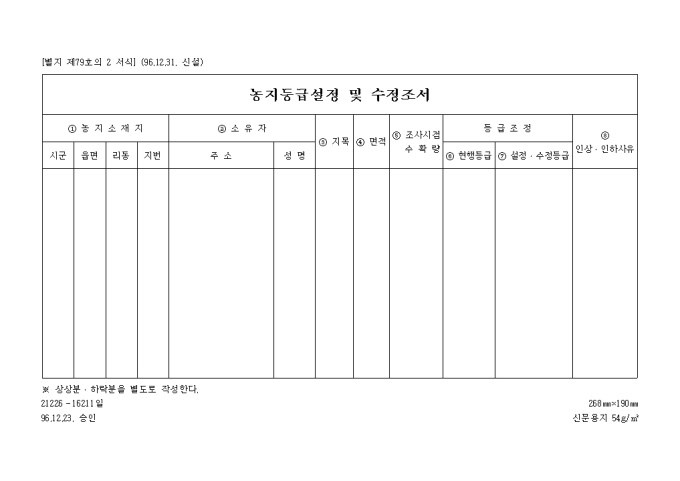 농지소재지,소유자,지목,면적,조사시점수확량,등급조정등의 항목으로 구성된 양식입니다.