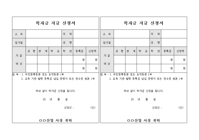 회사에서 직원의 학자금 지급시 사용되는 학자금 지급 신청서입니다. 지급 대상에 따른 신청액의 기록이 가능합니다.