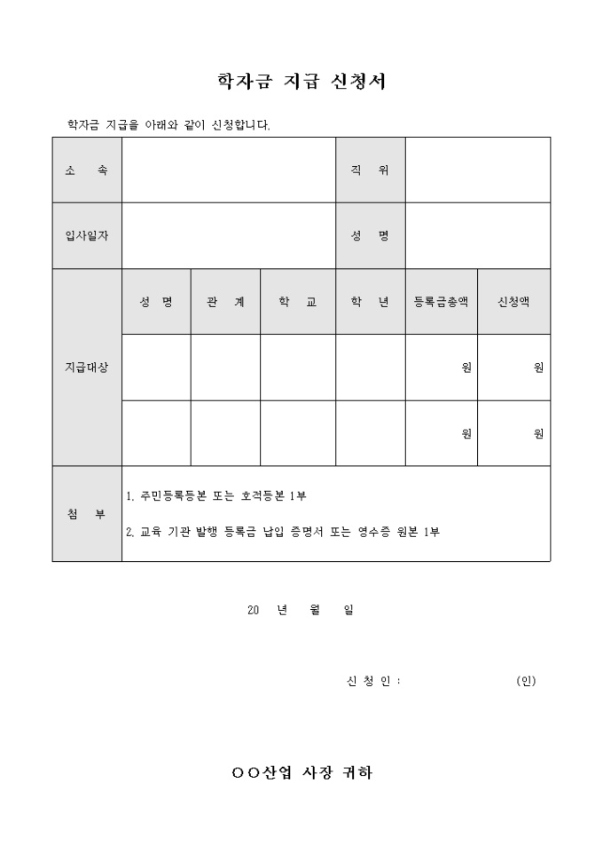 9,000원/월회사에서 직원의 피 부양자의 장학금 지급시 사용되는 학자금 지급신청서 입니다. 수혜대상자는 2명입니다.