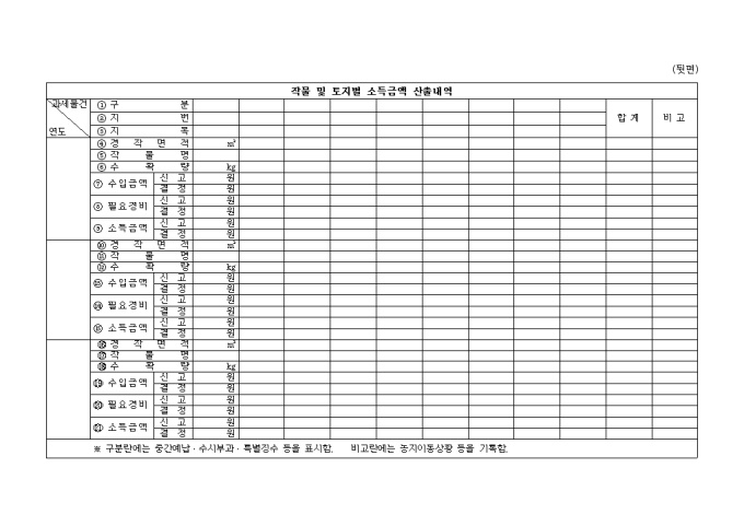 9,000원/월[별지 제89호 서식] 농지세대장 양식입니다. 소득금액 산출내역, 작물 및 토지별 소득금액 산출내역의 세부항목으로 구성된 양식입니다.