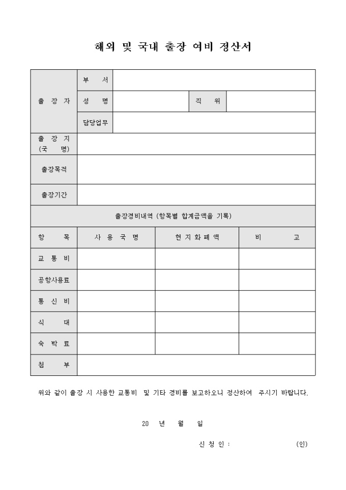 해외 및 국내 출장 여비 정산서