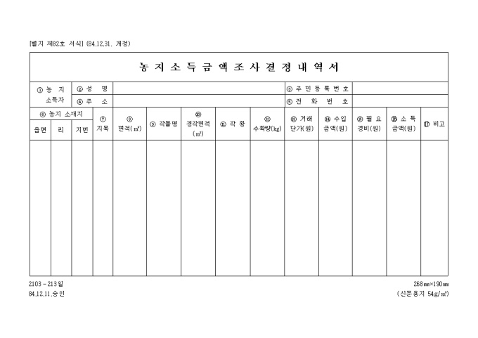 9,000원/월[별지 제82호 서식] 농지소득금액조사결정내역서 양식입니다. 농지소득자 간략이력과 농지소재지, 지목, 면적, 작물명, 경작면적등의 항목으로 구성된 양식입니다.