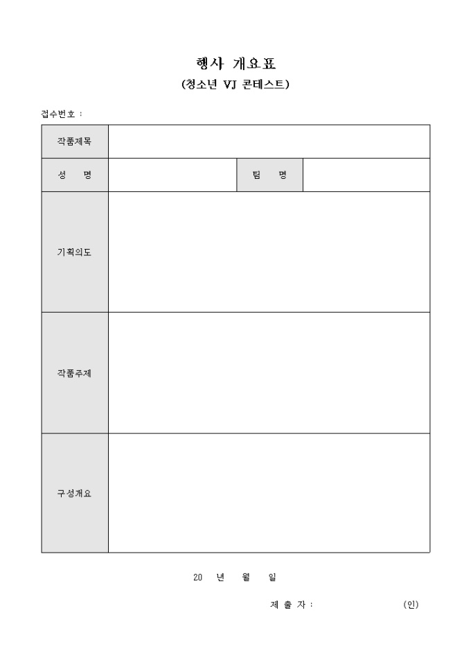 청소년 VJ 콘테스트 등의 행사에 참가하기 위해 작성하는 행사 개요표 양식으로 작품제목 및 기획의도, 작품주제, 구성개요 등의 항목을 기재하여 제출할 수 있습니다.
