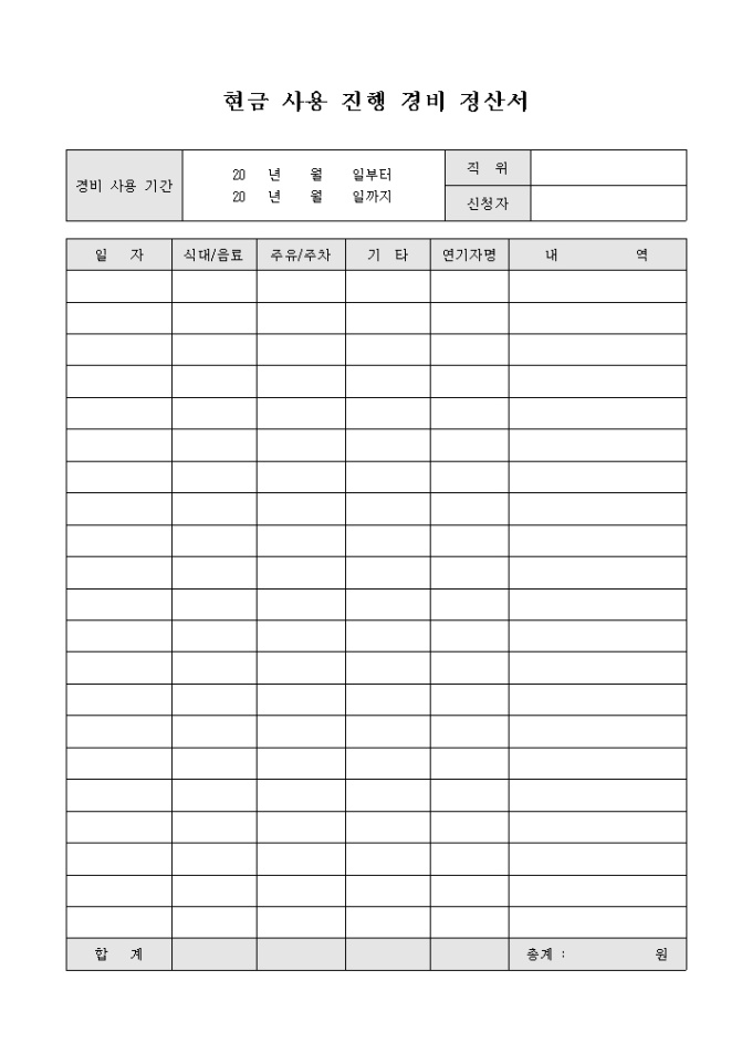 경비의 사용 내용중 현금 사용에 대한 정산시 사용되는 정산서 입니다. 일자별 사용내역을 기록하여 제출합니다.