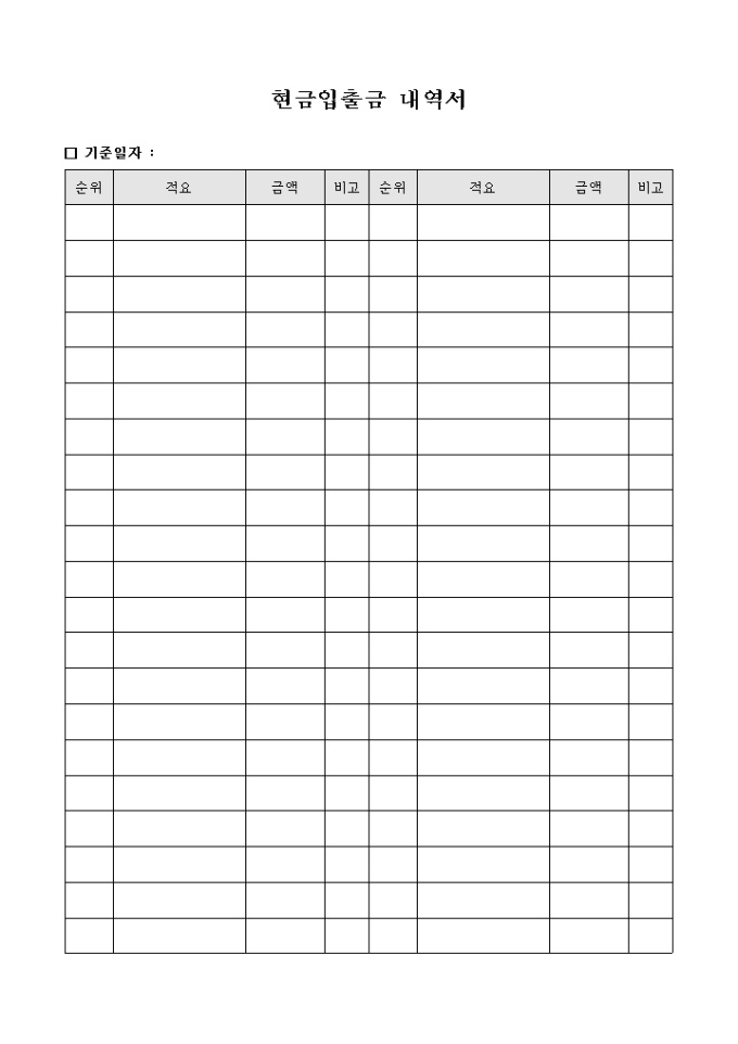 현금의 입금 또는 출금 내역을 기록하는 현금출금 내역서 양식입니다. 기준일자를 기재하고 적요 및 입출금 금액에 대하여 기재할 수 있습니다.