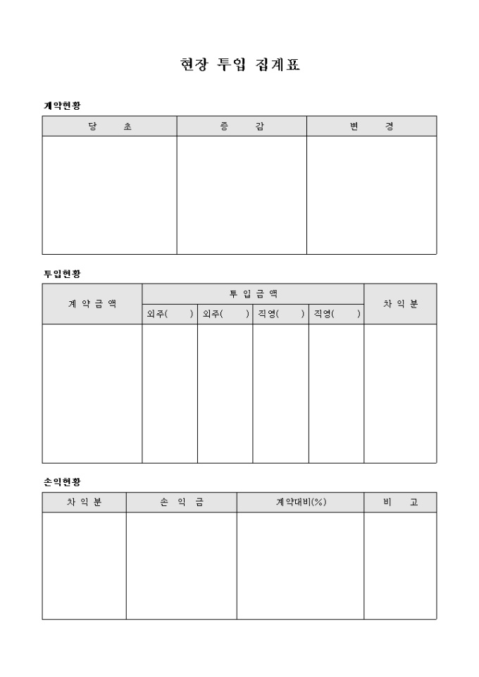9,000원/월당초 계약 사항과 증감 내역, 변경 사항 등을 기재할 수 있는 계약현황과 실제 현장에 투입된 투입현황, 투입에 따른 손익 사항을 기재할 수 있는 손익현황 등으로 구성된 현장 투입 집계표 양식입니다.