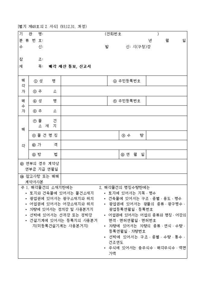 매각재산통보,신고서 양식입니다.