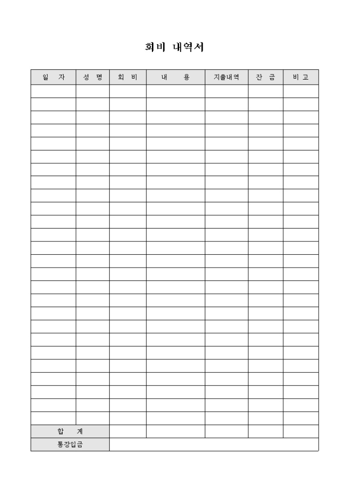 9,000원/월회비의 일자와 지출내역, 잔금을 기록하여 사용 할 수 있는 회비 내역서 입니다.