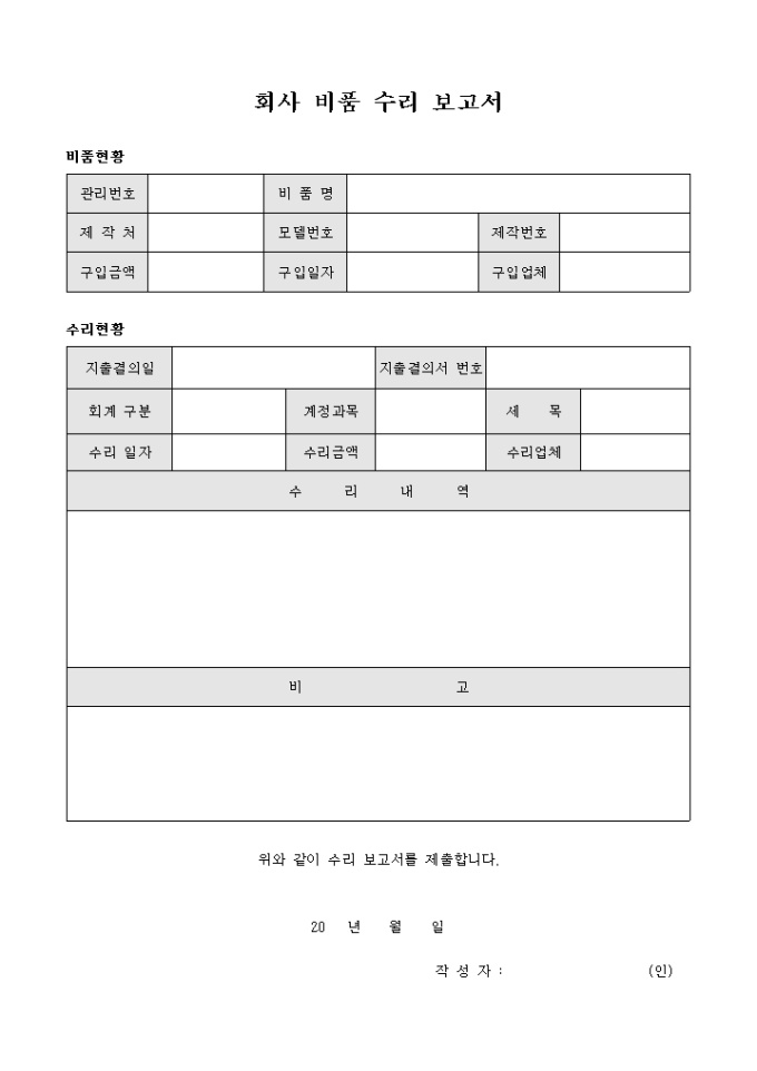 9,000원/월회사의 비품의 수리를 보고 할 때 사용합니다. 수리현황과 수리내역을 서술 할 수 있으며 제출시 사용합니다.