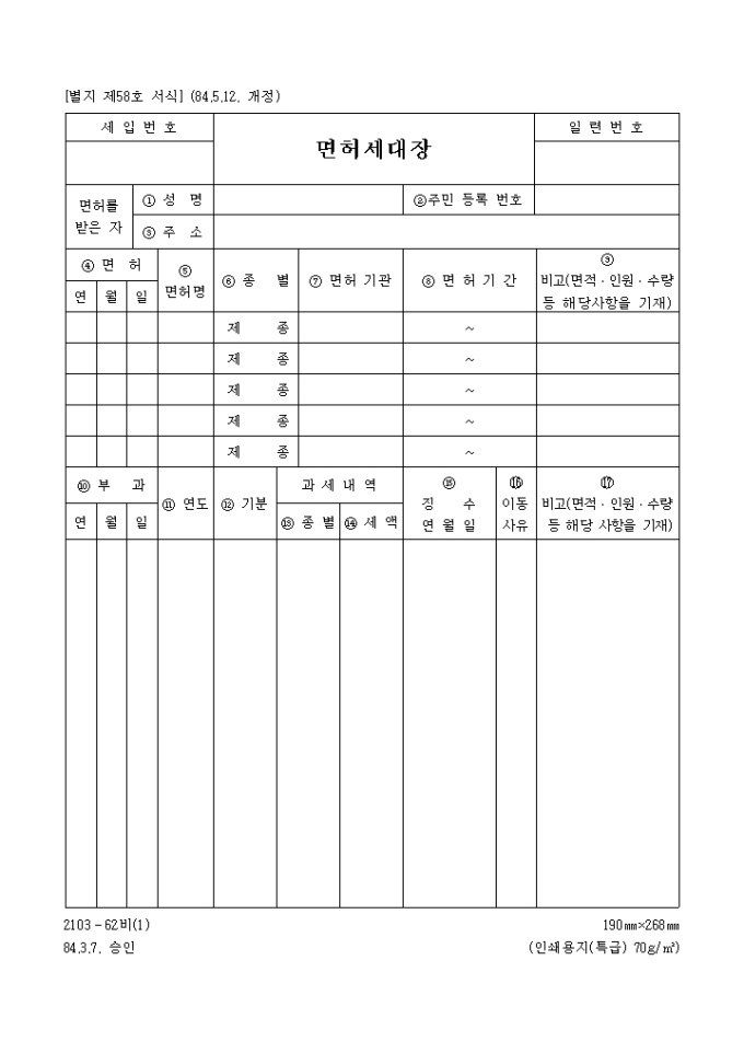 9,000원/월[별지 제58호 서식] 면허세대장 양식입니다. 면허를 받은자의 간략이력과 면허년월일, 면허명, 종별, 기관, 기간, 비고등의 항목으로 구성된 양식입니다.