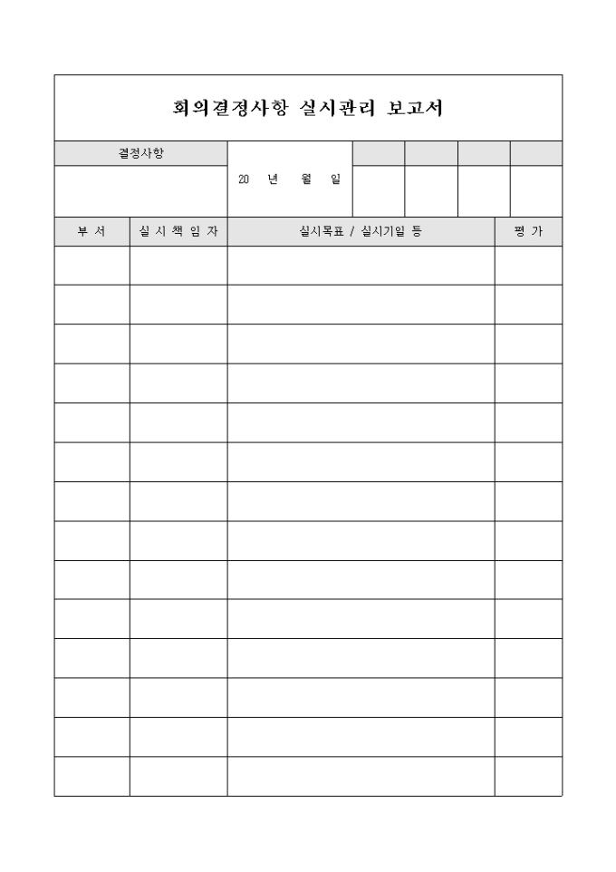 9,000원/월회의에서 결정된 사항에 대하여 각 부서별로 실시한 내역을 보고하는 회의 결정 사항 실시 관리 보고서 양식으로 부서와 실시책임자, 실시목표 및 실시기일, 항목 등의 내용을 기재할 수 있습니다.