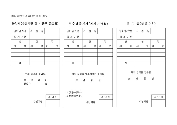 불입서,수납기관및시군구금고용 양식입니다.