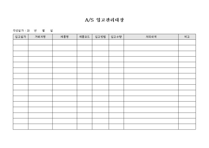 9,000원/월A/S를 요청하여 입고한 물품에 관한 현황을 관리하기 위해 만들어졌으며 물품에 관한 정보, 처리내역 등을 기재하여 사용할 수 있게끔 제작된 서식입니다.