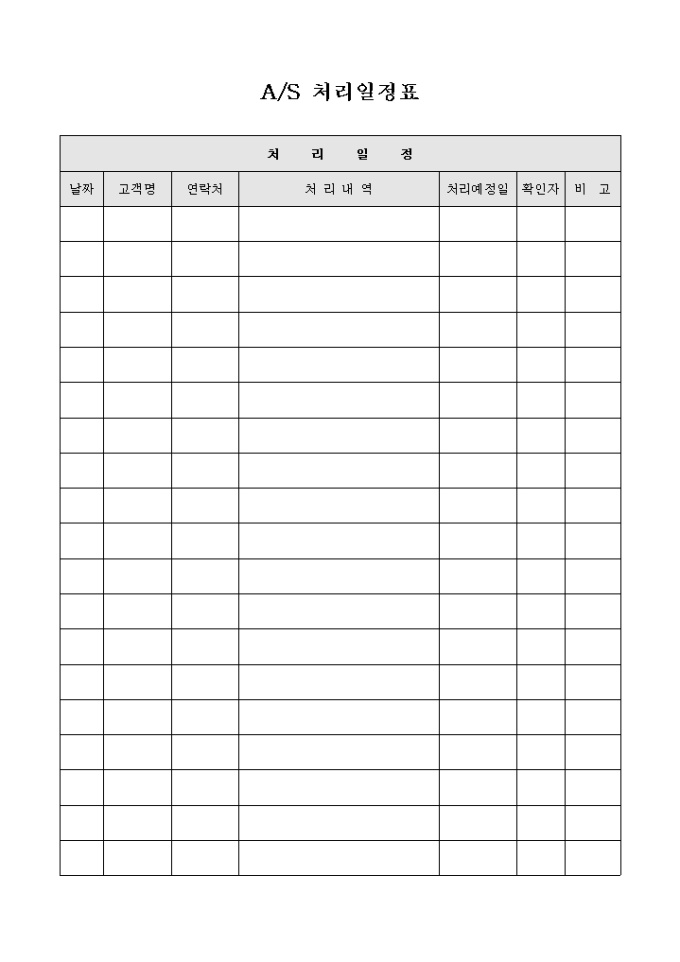 9,000원/월A/S 처리 일정을 관리하기 위해 만들어졌으며 고객의 인적사항, 처리내역, 예정일 등을 기재할 수 있게끔 제작된 서식입니다.