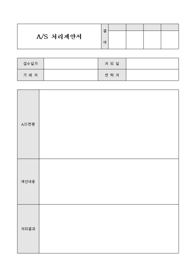 A/S 처리와 관련하여 제안하고픈 의견이 있을 때 사용할 수 있도록 만들어졌으며 A/S 현황, 제안내용, 처리결과를 서술형태로 작성할 수 있게끔 제작된 서식입니다.