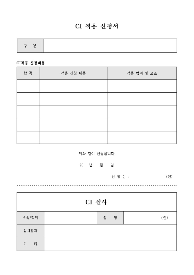 9,000원/월CI의 적용을 신청하는 신청서 서식으로 CI를 적용하기 위한 항목과 적용신청내용 및 적용 범위 및 요소를 작성할 수 있으며 CI의 심사 항목도 포함되어 있습니다.