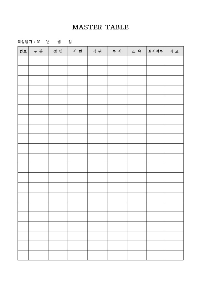 9,000원/월회사내 전문인력에 대하여 기록, 관리하기 위한 MASTER TABLE 서식입니다. 구분, 성명, 사번, 직위, 부서, 소속, 퇴사 여부 등의 항목으로 구성되어 있습니다.
