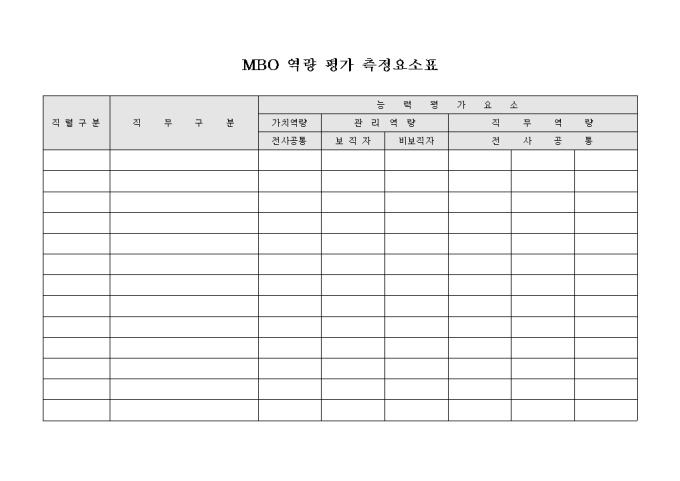 9,000원/월목표 관리 역량을 평가하기 위한 측정요소를 기록할 수 있는 MBO 역량 평가 측정요소표 양식입니다. 직렬구분과 직무구분, 능력 평가 요소 등의 항목으로 구성되어 있습니다.