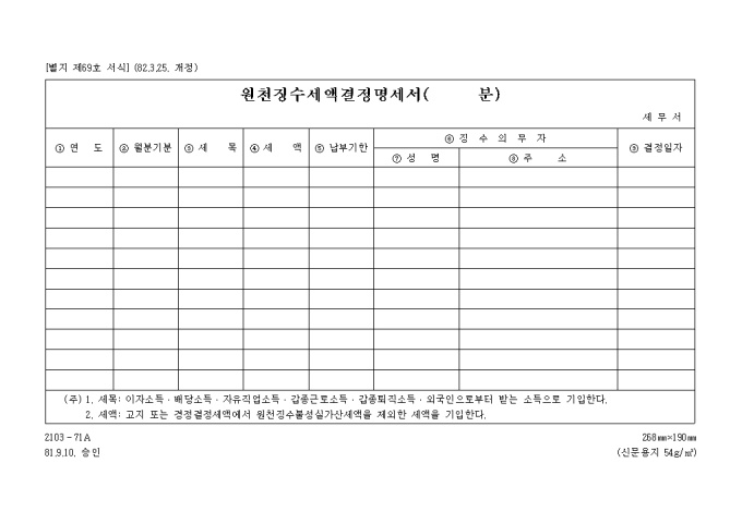 [별지 제69호 서식] 원천징수세액결정명세서 양식입니다. 연도, 월분기분, 세목, 세액, 납부기한, 징수의무자, 결정일자등의 항목으로 구성된 양식입니다.