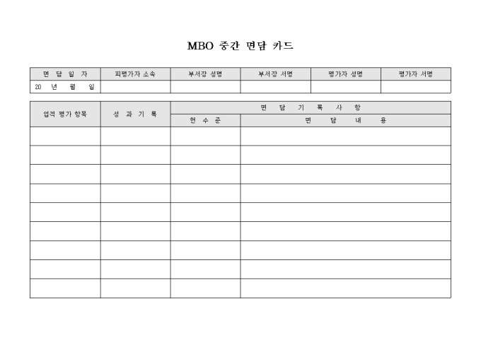 9,000원/월MBO 중간 면담 사항에 대하여 그 내용을 기록할 수 있는 MBO 중간 면담 카드 서식입니다. 피평가자에 대하여 업적 평가 항목, 성과기록, 면담기록사항 등의 항목에 대하여 기록할 수 있습니다.