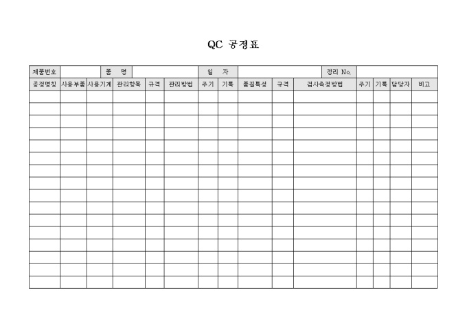QC 공정에 따른 검사측정에 대한 내용을 기록 한 것입니다. 공정 명칭별 관리 방법과 측정방법을 기록 할 수 있습니다.