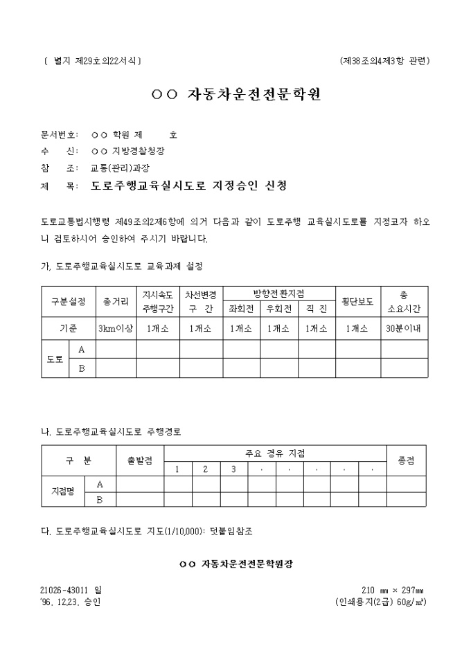 9,000원/월도로교통법시행령 제49조의2제6항에 의거한 별지 제29호의22서식 도로주행교육실시도로 지정승인 신청입니다.