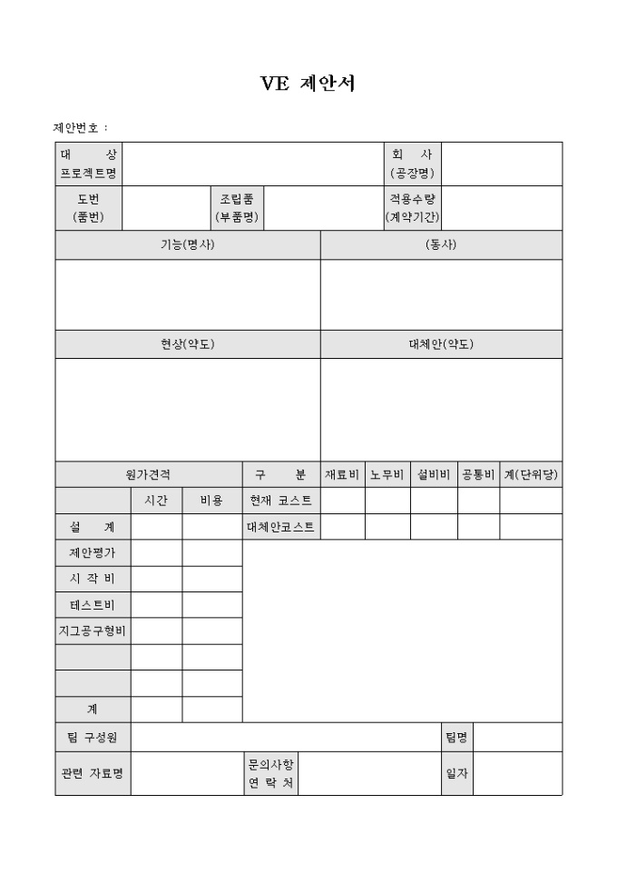 9,000원/월VE제안서 입니다. 기능과 현상, 대체 안에 대한 제안시 사용됩니다.