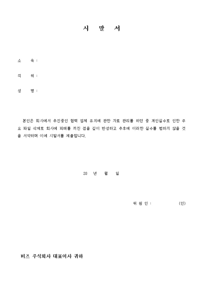 9,000원/월자료 관리를 하던 중 개인실수로 인한 주요 파일 삭제로 회사에 피해를 끼치게 됐을 때 제출할 수 있는 시말서입니다.