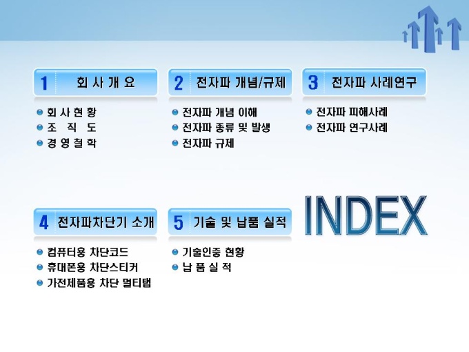 전자파 차단기 제조업체의 회사소개서입니다. 목차는 1.회사개요 2.전자파 개념 및 규제 3.전자파 사례연구 4.전자파 차단기 소개 5.기술 및 납품실적으로 구성되어있습니다.