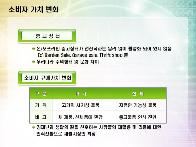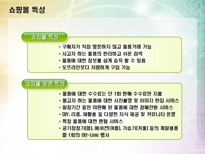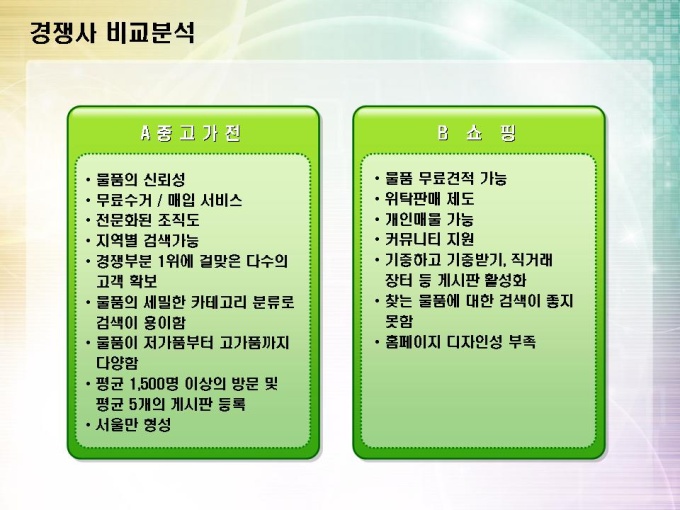 중고 가전제품 쇼핑몰 사업계획서입니다. 목차는 1.사업개요 2.사업특성 및 목표 3.환경분석 4.마케팅 전략 5.사업계획 및 비전으로 구성되어있습니다.