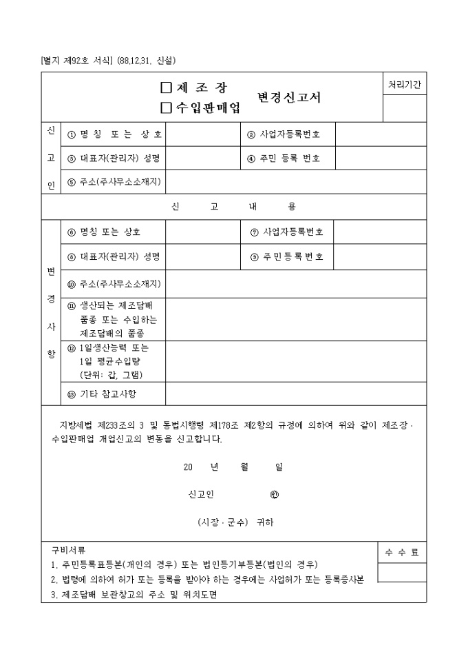 지방세법 제233조의 3 및 동법시행령 제178조 제2항의 규정에 의하여 위와 같이 제조장· 수입판매업 개업신고의 변동을 신고하실때 사용하는 양식입니다.