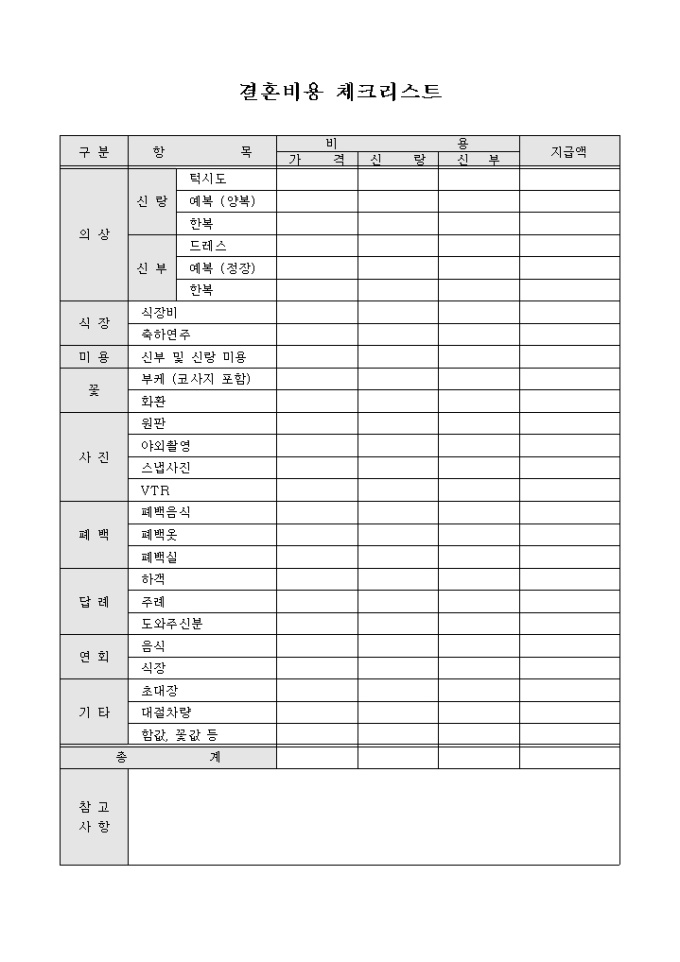 결혼식에 소요되는 비용을 확인하기 위해 각 항목별로 기록해보는 결혼비용 체크리스트 양식입니다. 결혼식에 소요되는 의상, 식장, 미용, 꽃, 사진 등 모든 사항에 대한 비용과 실 지급액을 기재할 수 있습니다.